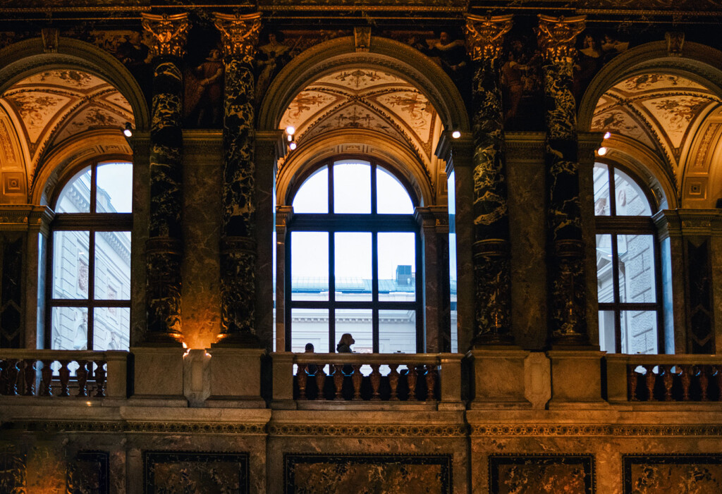 The ornate columns adorned with gold ornaments exemplify the remarkable artistry of architecture from past eras. Vienna is home to numerous such structures, including museums, palaces, and churches, each reflecting the city’s rich architectural heritage. Notably, this particular photograph was captured using a Leica M10 camera, renowned for its high-quality imagery.